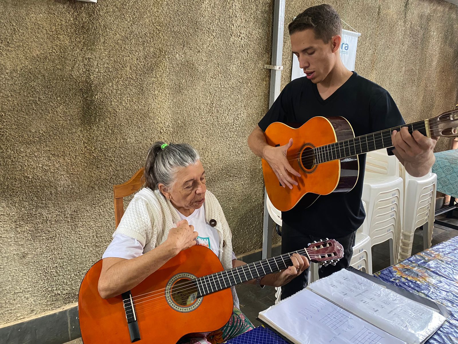 Uma vez por semana, a instituição abre suas portas para a oficina de música, que acontece em dois horários: das 7h às 8h, para aqueles que desejam aprimorar suas habilidades musicais, e das 8h às 9h, para os iniciantes nessa jornada sonora. O encontro acontece sempre às terças-feiras e é conduzido pelo professor Matheus Moura.